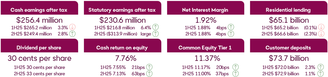 Cash earnings of $256.4 million for 1H26 were 2.8% higher than 2H25, with income growth of 3.7% and expense growth of 4.2%. Customer deposit balances grew 1.1% whilst lending balances contracted 1.9%. Net Interest Margin increased 4 basis points over the half to 1.92%, reflecting our strategy to optimise our deposit franchise, with growth in lower-cost deposits supported by our refreshed Bendigo app.
