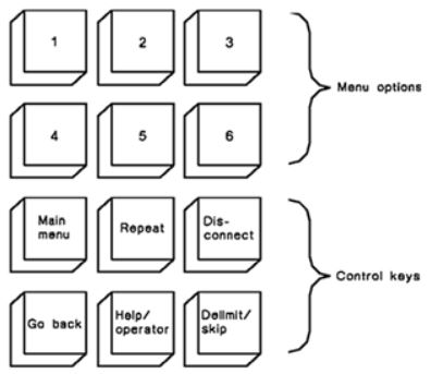 The following diagram shows the industry standard telephone keypad layout for IVR (Interactive Voice Response) systems. The numbers 1 to 6 are used for standard Menu options and the numbers 7 to 0 and the * and # function keys are used for other control commands as described on the relevant keys.
